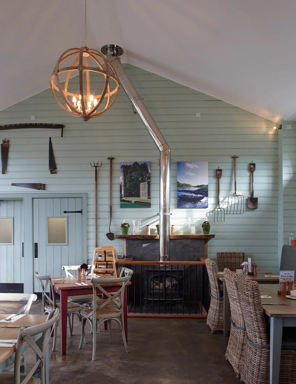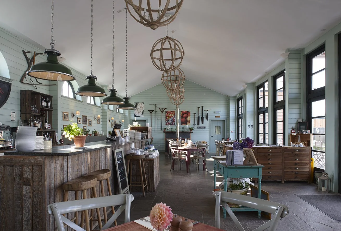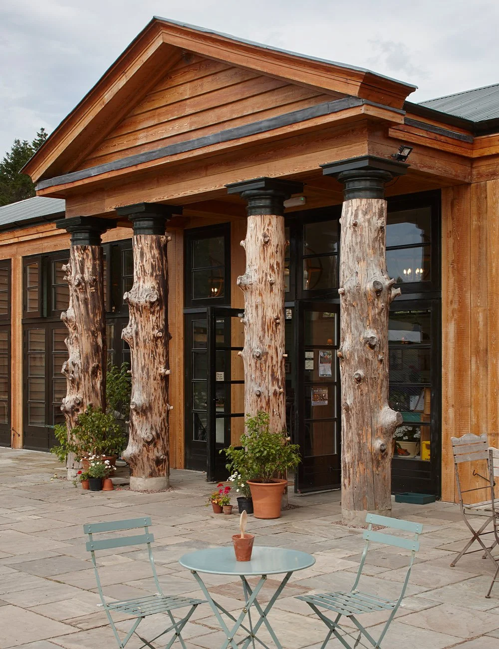 The restoration of historic garden buildings, and the construction of a new café and learning centre, within a very large walled kitchen garden connected with a historic estate. The new building uses simple rustic materials, with a corrugated iron roof and oak weatherboarded walls, in a formal Classical arrangement of a central portico flanked by pedimented wings. The portico columns are tree trunks, a motif found elsewhere in Scotland, and a reminder of the idea of the ‘primitive hut’ as the origin of Classical temple architecture. The café and learning centre include a commercial kitchen, rooms for meetings and mentoring, and staff facilities to support the public visitors to the walled garden.