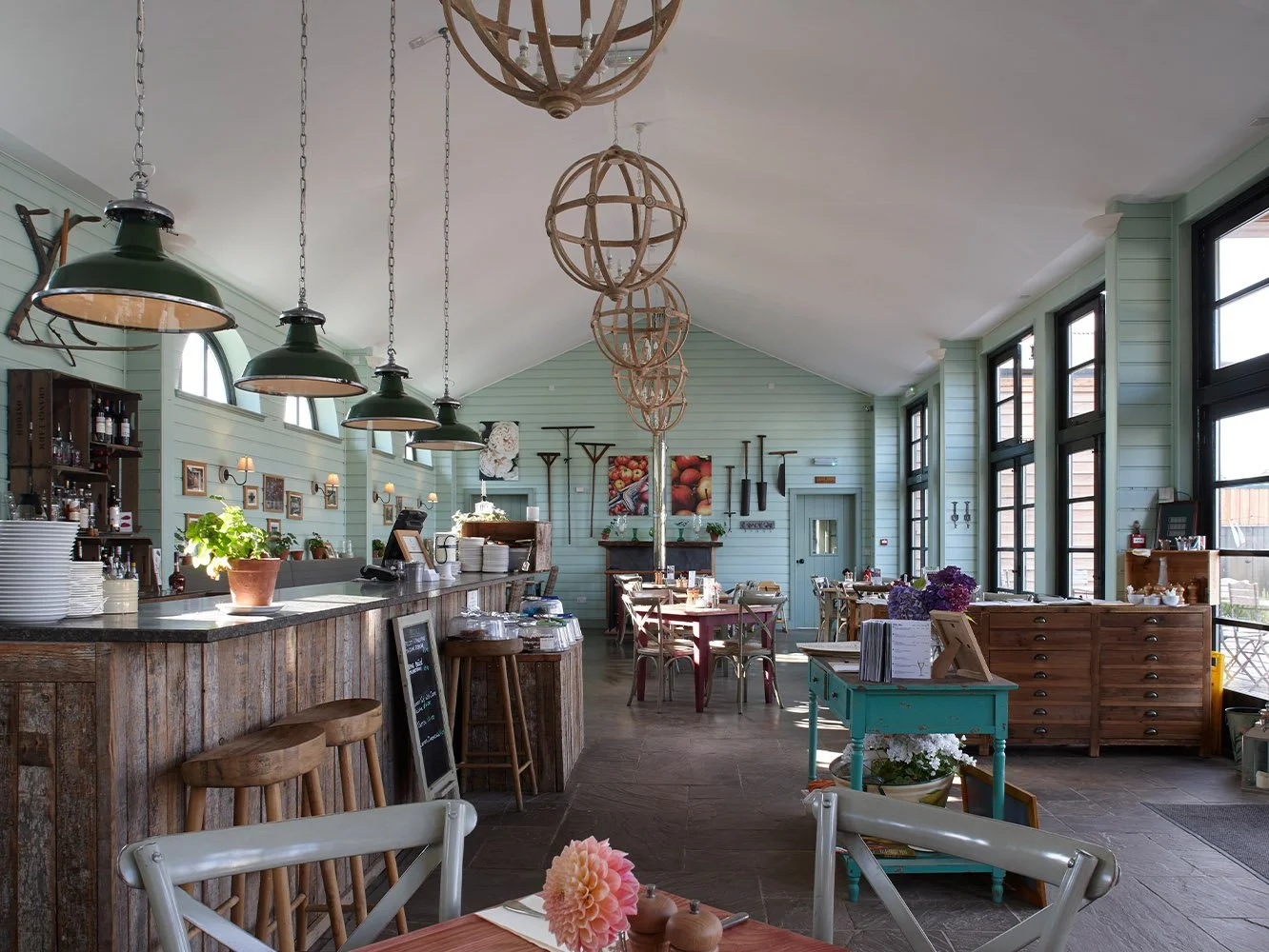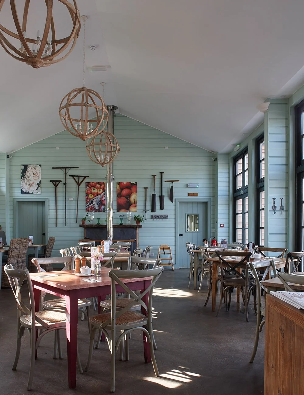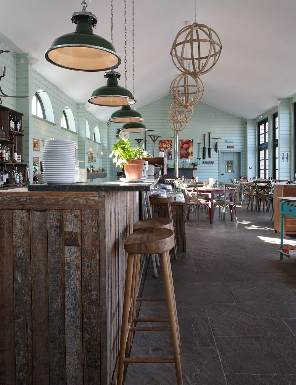 The restoration of historic garden buildings, and the construction of a new café and learning centre, within a very large walled kitchen garden connected with a historic estate. The new building uses simple rustic materials, with a corrugated iron roof and oak weatherboarded walls, in a formal Classical arrangement of a central portico flanked by pedimented wings. The portico columns are tree trunks, a motif found elsewhere in Scotland, and a reminder of the idea of the ‘primitive hut’ as the origin of Classical temple architecture. The café and learning centre include a commercial kitchen, rooms for meetings and mentoring, and staff facilities to support the public visitors to the walled garden.