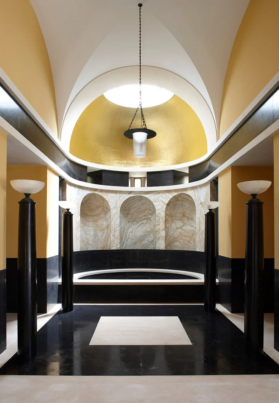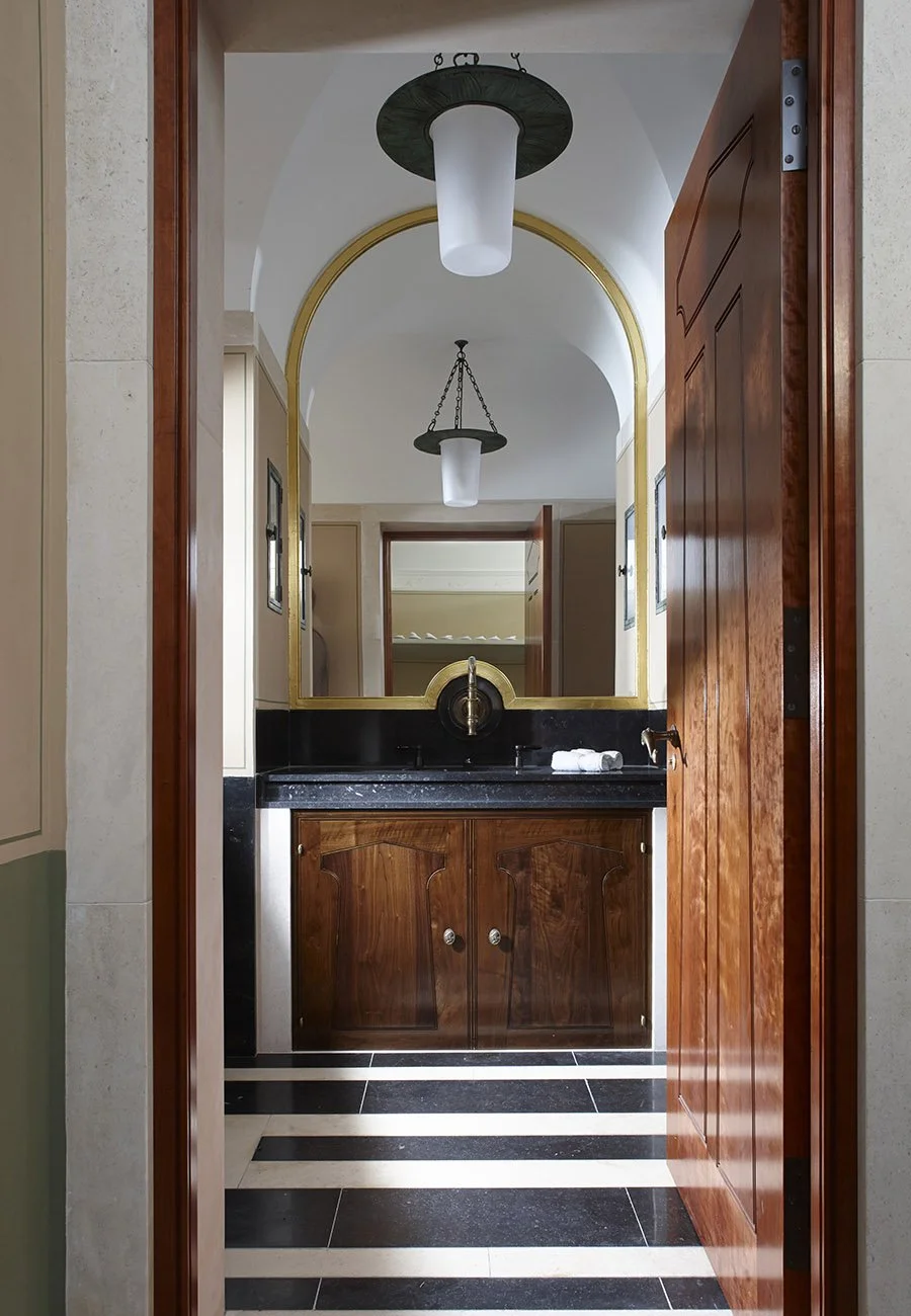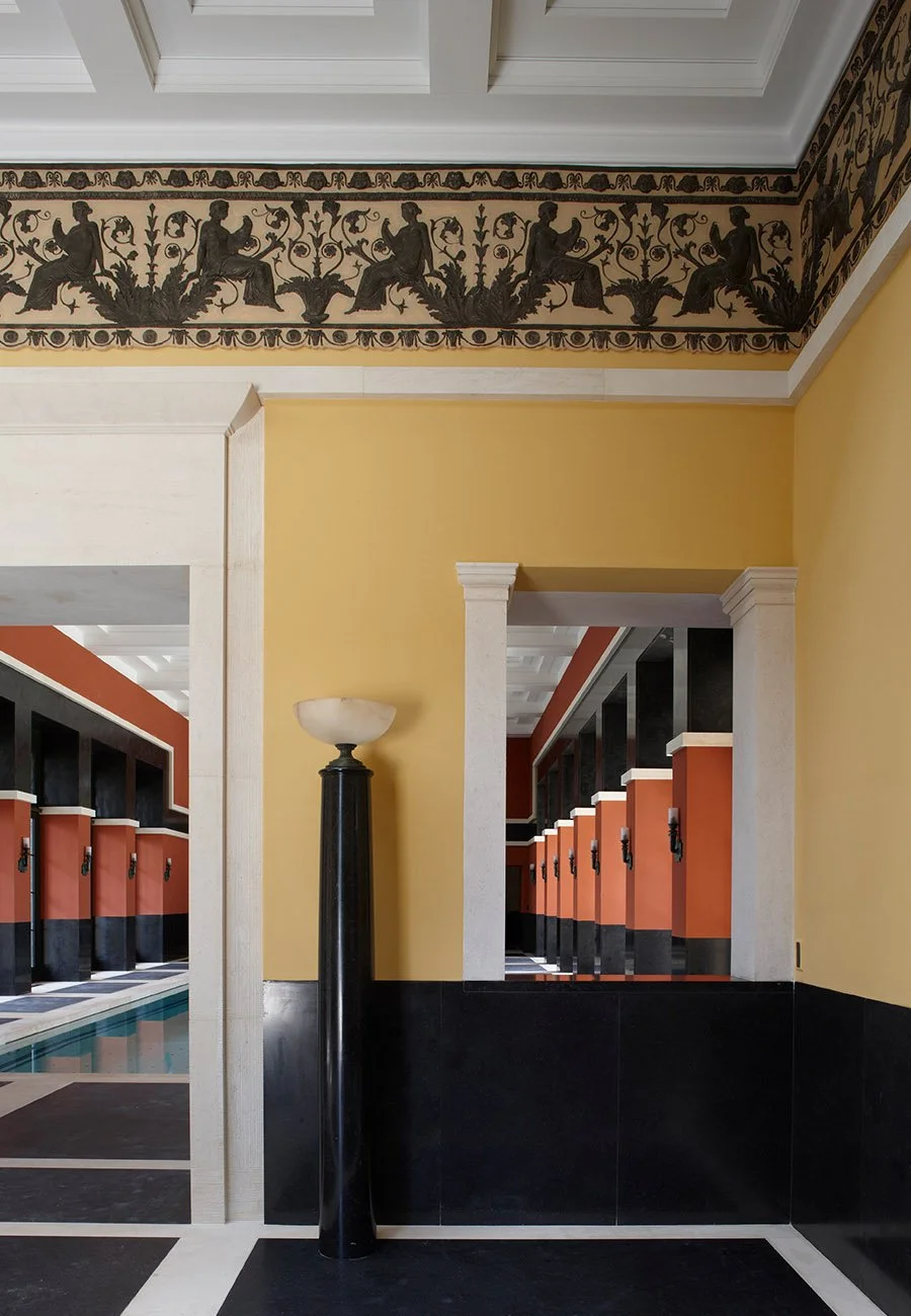 A new bath house in the grounds of a historic country house, containing an indoor swimming pool, gymnasium and sauna. Conceived as a temple in the park, it draws on the tradition of ornamental garden buildings, as well as private bath houses including K. F. Schinkel’s Roman Baths at Potsdam. A bas-relief by Classical sculptor Alexander Stoddart was commissioned for the west elevation. The project included bespoke design by the Practice of lighting fixtures, door handles, taps, furniture and other fittings, in harmony with the architecture.